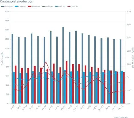 2025年12月全球70個(gè)納入世界鋼鐵協(xié)會(huì)統(tǒng)計(jì)國(guó)家/地區(qū)的粗鋼產(chǎn)量為1.396億噸,同比下降3.7%。
