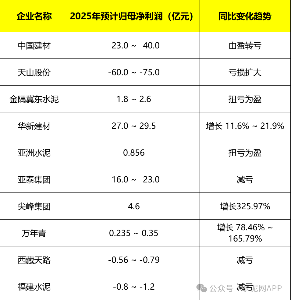 近日,多家水泥企業(yè)2025年度業(yè)績預報發(fā)布,具體見下: